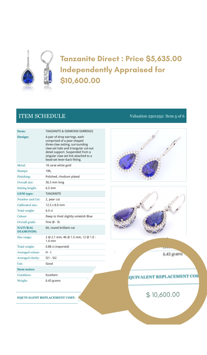 For the most unbiased result, simply drop the item to your local jeweller without sharing any paperwork or details about where you bought your tanzanite. This gives you a truly independent valuation you can trust completely. Then send us in a copy of the appraisal and well refund you $150.00