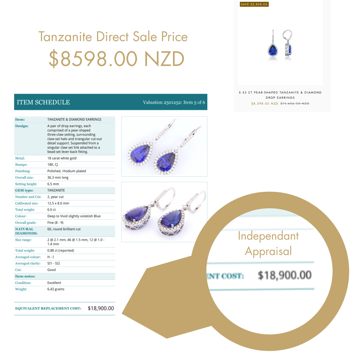 We always encourage independent appraisals. This pair, for example, was verified to have over $10,000 in savings by the respected Jewellery Valuation Centre 9n Parnell, Auckland.