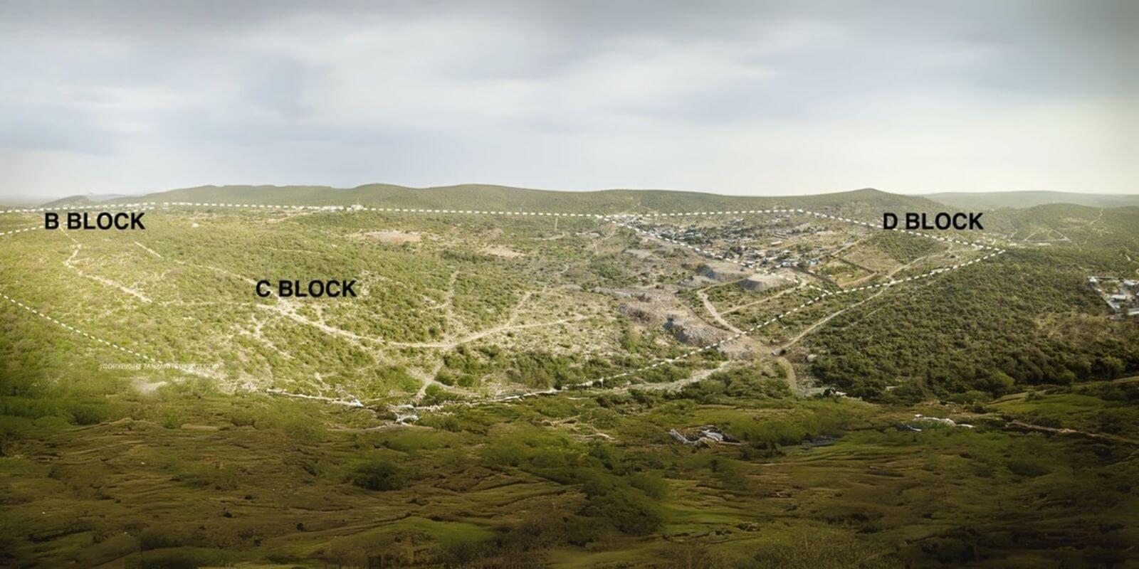 Aerial view of the world’s only tanzanite deposit. The whole area is only 7 km x 1 km. In 1990, the Tanzanian Government split up the area into four blocks, named A through D.