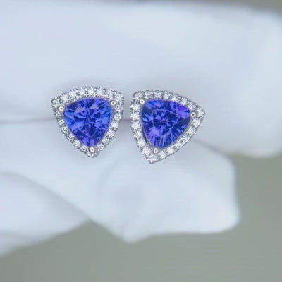 These 18K white gold earrings feature striking trillion-cut tanzanite gemstones framed by a halo of sparkling round diamonds. With their deep violet-blue brilliance and refined craftsmanship, they add timeless elegance to any jewelry collection.