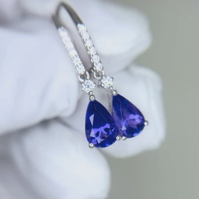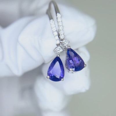 These 18K white gold tanzanite earrings showcase vibrant violet-blue gemstones accented with sparkling diamonds. Elegant and timeless, they are the perfect accessory for both everyday wear and special occasions.