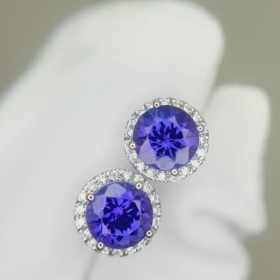 Crafted in 18K white gold, these stunning earrings feature exceptionally bright and vividly colored round-cut tanzanite gemstones, each encircled by a halo of sparkling diamonds. Graded at the highest color level, ( vb 6/6 or AAA+) these finest-quality tanzanites display the rarest and richest violet-blue hue that tanzanite this size can display. Own a perfect pair of the finest tanzanites !