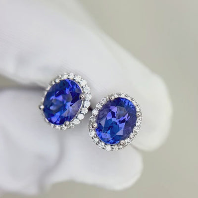 Exquisite tanzanite oval stud  earrings, featuring stunning oval-cut stones in a remarkably vivid blue hue with a daimond halo.  Almost pure blue at first glance, each tanzanite reveals subtle flashes of violet when tilted in the light—an enchanting play of color that speaks to their exceptional quality.