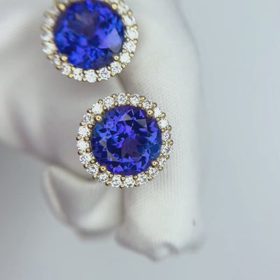 Exceptional Tanzanite and Diamond Halo Stud Earrings – 18ct Yellow Gold