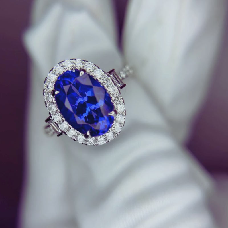 3.40 Ct Oval Tanzanite Ring with Baguette Diamonds & Halo