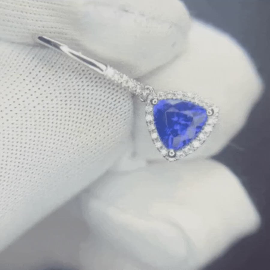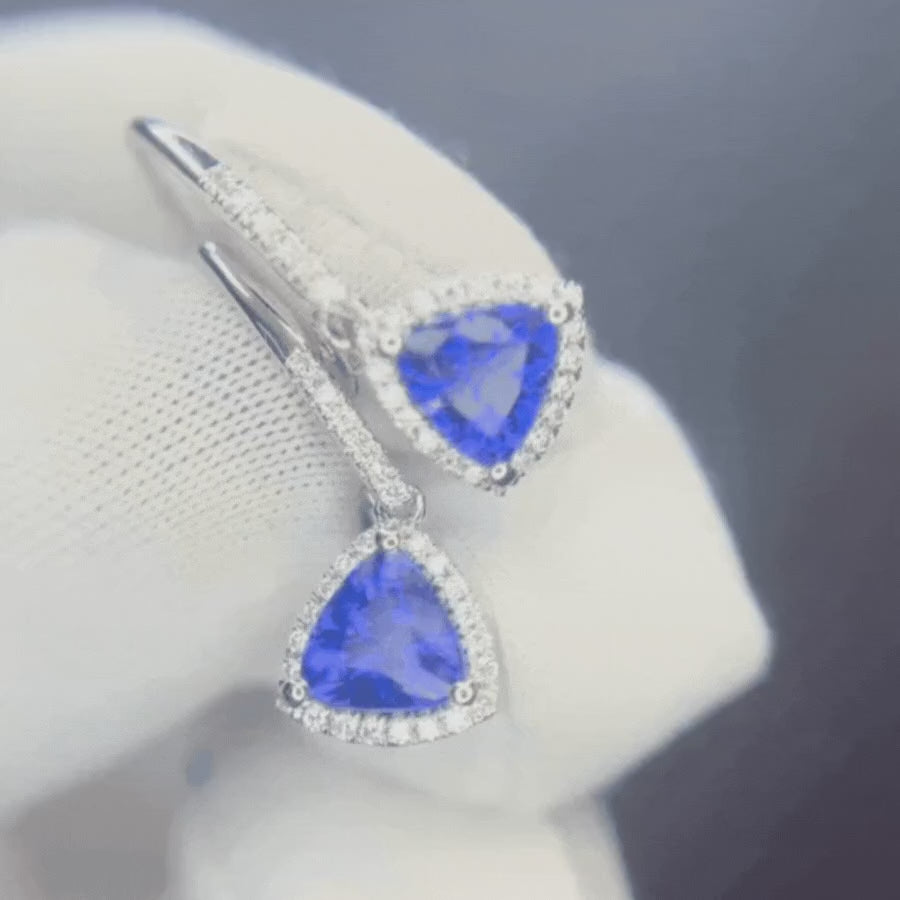 Trillion Cut Tanzanite & Diamond Halo Dangle Earrings