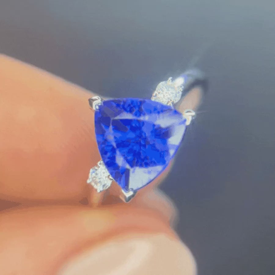 This striking ring features a 2.36-carat trillion-cut tanzanite in a vivid, richly saturated blue with hints of violet, full of sparkle and life.